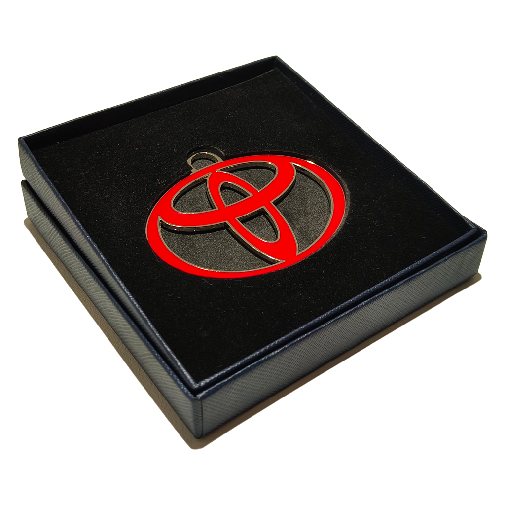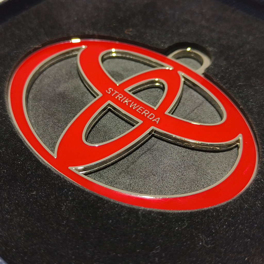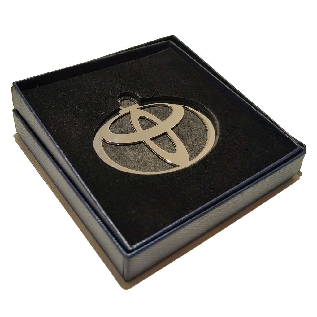 Prachtige kerstboom hanger in de vorm van het Toyota logo, aan één zijde voorzien van "Strikwerda" opdruk. Wordt geleverd in luxe geschenkverpakking. Leverbaar in twee kleuren, volledig zilver of zilver met rode inleg.